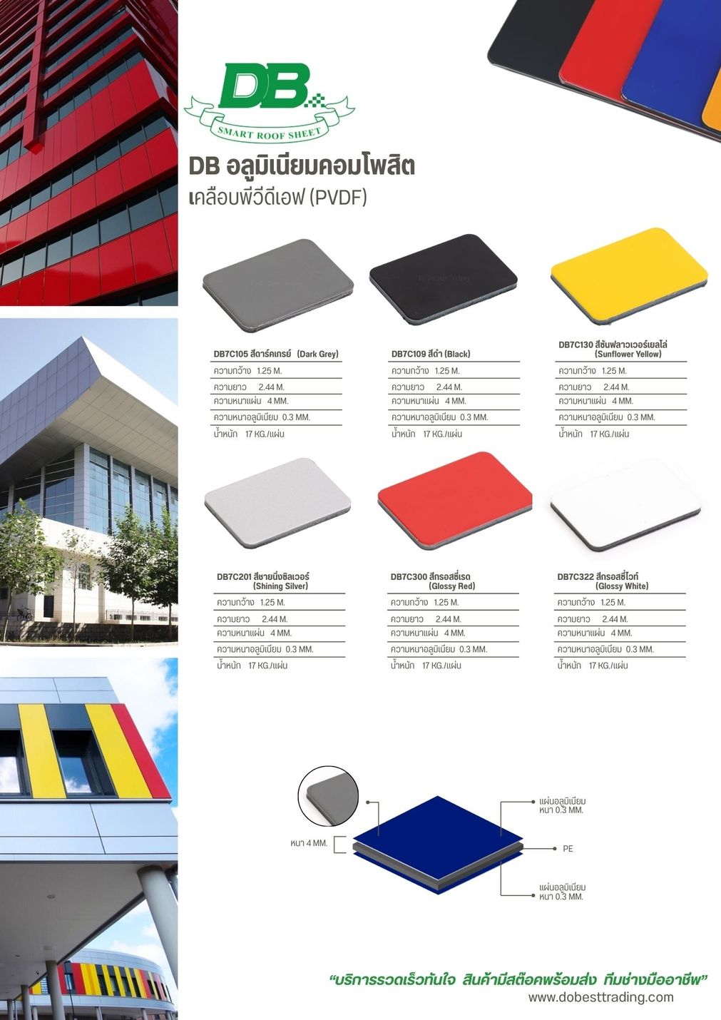 แผ่นอลูมิเนียมคอมโพสิต (Aluminium Composite) ยี่ห้อ DB เป็นแผ่นสำหรับงานออกแบบ-ปรับปรุงโครงสร้างอาคารขนาดใหญ่ หรือ อาคารสำนักงาน ต่าง ๆ นิยมใช้วัสดุแผ่นอลูมิเนียมคอมโพสิตในการตกแต่ง เพื่อความสวยงาม หรูหรา แผ่นอลูมิเนียมคอมโพสิตมีโครงสร้างเชิงประกอบ มีความบางแต่มีความแข็งแรงสูง แกนกลางเป็นโพลีเอทิลีนความหนาแน่นต่ำ (LDPE) ความสามารถของแผ่นอลูมิเนียมคอมโพสิตมีความทนต่อการกัดกร่อนได้ดี ไม่เกิดสนิม และน้ำหนักเบา เมื่อเทียบกับเหล็ก ใช้งานได้ทั้งภายนอกและภายใน