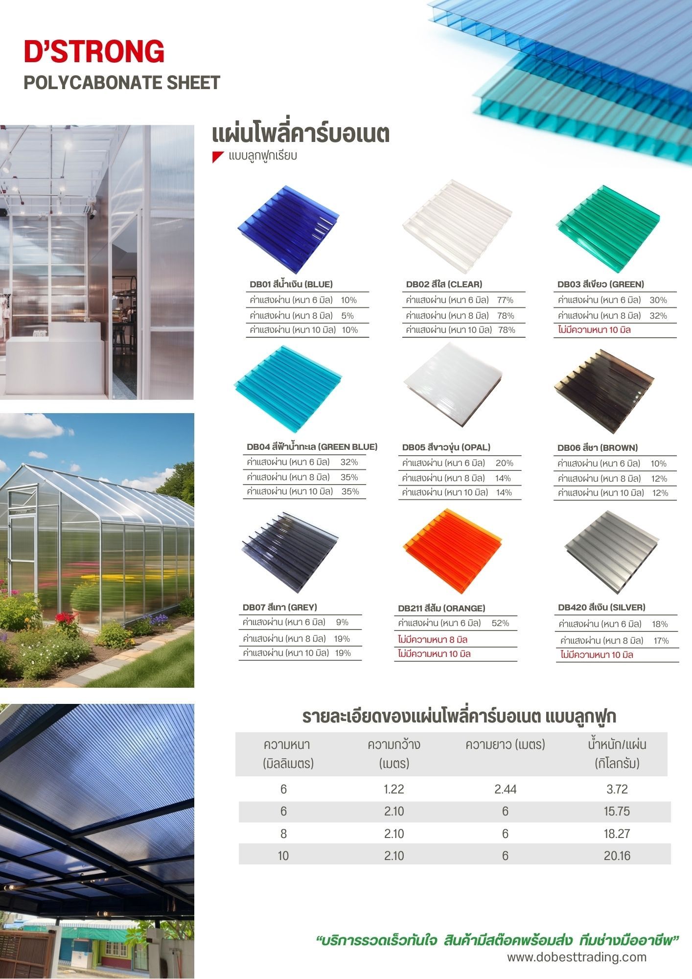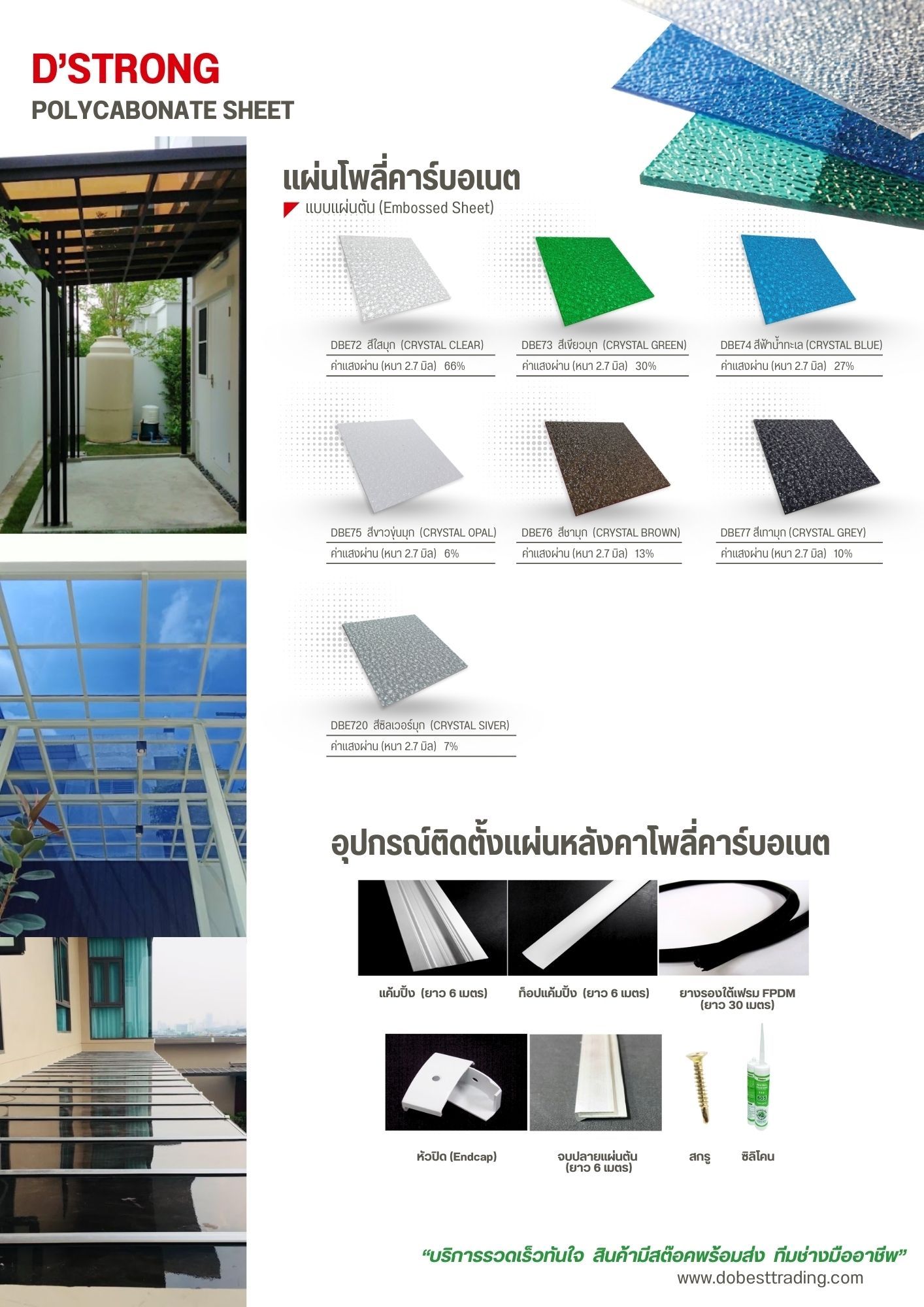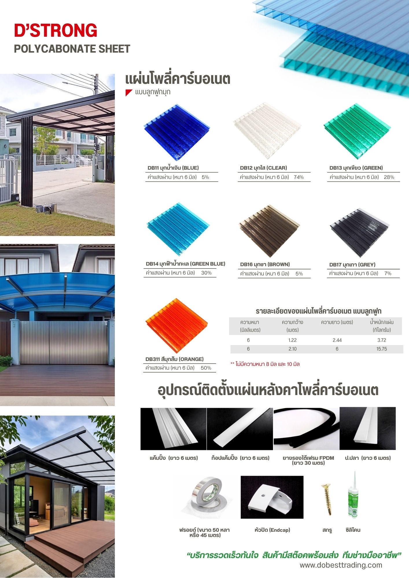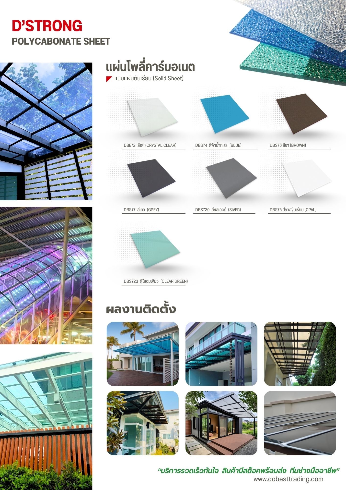 บริษัท ดู เบสต์ เทรดดิ้ง จำกัด เป็นผู้นำเข้าวัสดุแผ่นโพลี่คาร์บอเนต ยี่ห้อ D’Strong(ดีสตรอง) / แผ่นอลูมิเนียมลายไม้ ยี่ห้อ DB และตัวแทนจำหน่ายวัสดุหลังคา/กันสาด ยี่ห้อดีไลท์ (D-Lite) / ยี่ห้อโปรไลท์ (Pro-Lite) / ยี่ห้อดีกลาส (D-Glass) / แผ่นหลังคาไวนิล(Plastwood) ยี่ห้อภูเขา / แผ่นอลูมิเนียมคอมโพสิต (DB) / ซิลิโคนยาแนว (Pentens) และอุปกรณ์การติดตั้งหลังคา/กันสาด