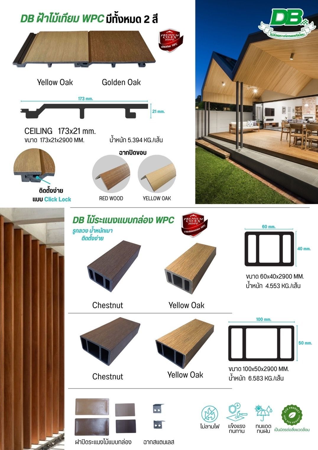 DBผนัง/ฝ้าไม้เทียม WPCมี 2 สี ให้เลือกสี Yellow Oak และ สี Golden Oakขนาด 173x21x2900 MM. น้ำหนัก 5.394 KG./เส้น