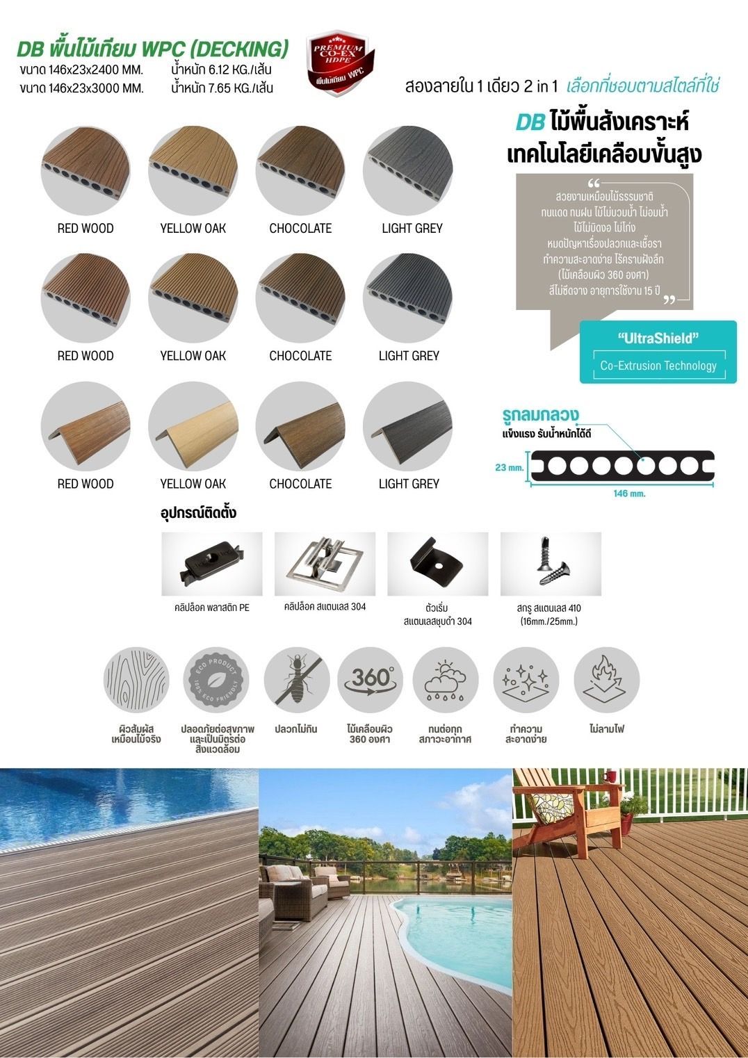 DBPF พื้นไม้เทียม WPCมีลายให้เลือก 2 ด้าน (ลายไม้ และ ลายร่องไม้)ตัวเลือก ขนาด 146x23x2400 MM. น้ำหนัก 6.12 KG./เส้นขนาด 146x23x3000 MM. น้ำหนัก 7.65 KG./เส้น