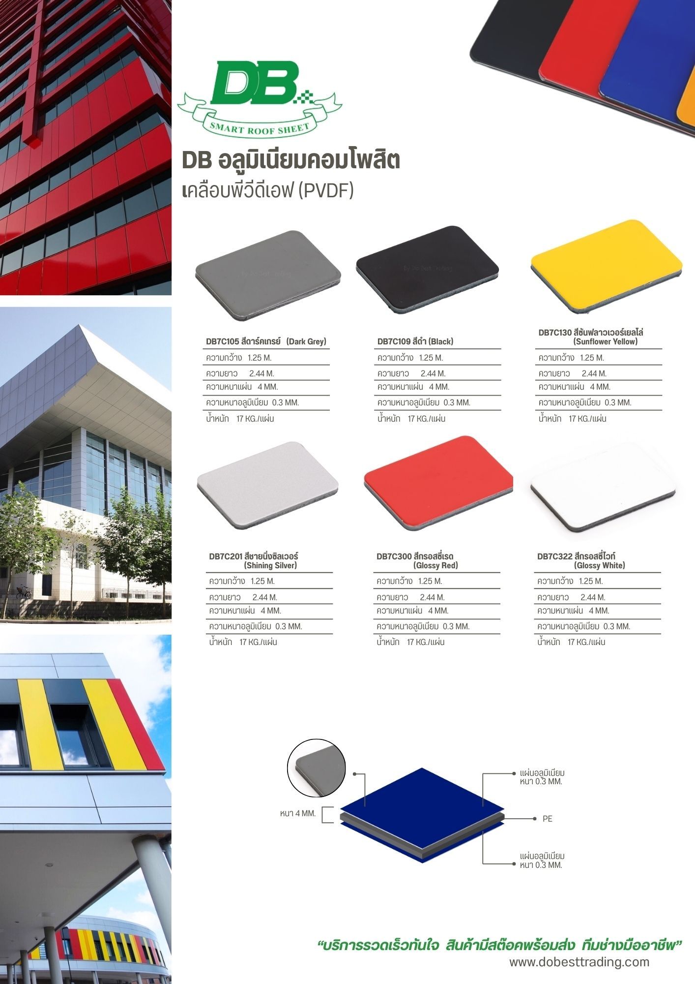 แผ่นอลูมิเนียมคอมโพสิต (Aluminium Composite) ยี่ห้อ DB เป็นแผ่นสำหรับงานออกแบบ-ปรับปรุงโครงสร้างอาคารขนาดใหญ่ หรือ อาคารสำนักงาน ต่าง ๆ นิยมใช้วัสดุแผ่นอลูมิเนียมคอมโพสิตในการตกแต่ง เพื่อความสวยงาม หรูหรา แผ่นอลูมิเนียมคอมโพสิตมีโครงสร้างเชิงประกอบ มีความบางแต่มีความแข็งแรงสูง แกนกลางเป็นโพลีเอทิลีนความหนาแน่นต่ำ (LDPE) ความสามารถของแผ่นอลูมิเนียมคอมโพสิตมีความทนต่อการกัดกร่อนได้ดี ไม่เกิดสนิม และน้ำหนักเบา เมื่อเทียบกับเหล็ก ใช้งานได้ทั้งภายนอกและภายใน