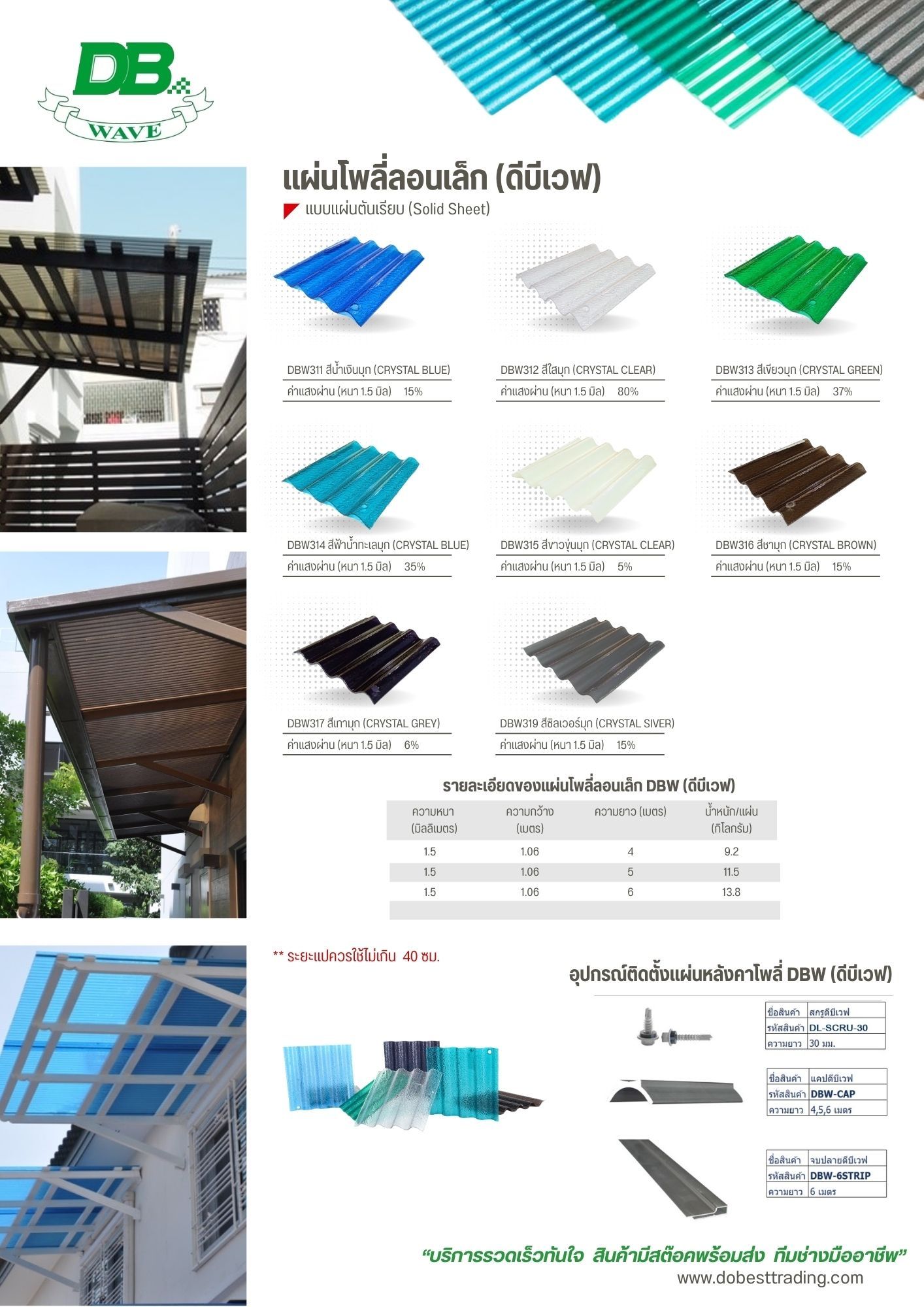 แผ่นหลังคา DB เวฟ หรือ DB WAVE เป็นหลังคาลอนเล็ก มีลักษณะโปร่งแสง คุณสมบัติชนิดเดียวกันกับแผ่นโพลี่คาร์บอเนต ชนิด แบบตัน ผลิตจากเม็ดพลาสติกแท้ 100% มีสีสันที่สดใส ติดตั้งง่ายเข้ากับตัวบ้านได้ทุกรูปแบบ ทุกสไตล์