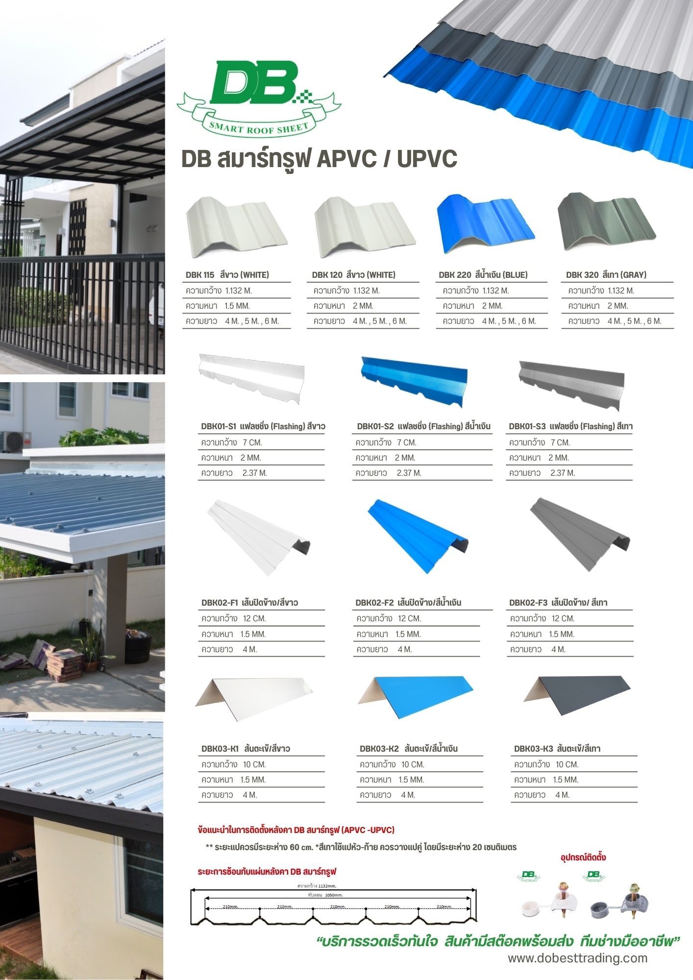 แผ่น หลังคาDB สมาร์ทรูฟ หรือเรียกอีกอย่างว่า "APVC/PVC" เป็นผลิตภัณฑ์ Polyvinyl chloride resin เป็นแผ่นทึบแสง กันความร้อนได้ดี เก็บเสียงได้ดีกว่าหลังคาแบบ Metal Sheet เน้นการติดตั้งง่าย สะดวก รวดเร็วกว่า
